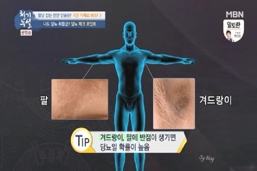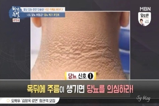 이런 현상들이 많이 나타나는 곳은 신체 부위 중에서도 목으로 주름뿐만 아니라 반점이 생기면 당뇨일 확률이 99%라고 하며, 겨드랑이나 팔에 반점이 생기면 당뇨일 확률이 높다고 합니다.